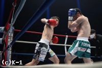 1R、高いガードのトファネリへ佐々木が右ローからパンチを4連打。頑丈さを感じさせるトファネリはジリジリと前進し強烈な右ローを放つ。下がる佐々木へトファネリの伸びる右ストレートがヒット。さらに右ローで佐々木が体勢を崩すシーンが見られる。トファネリは前進し圧力を強めるが、佐々木が右ボディから左フックをカウンターでヒットしダウンを奪う。立ち上がったトファネリへ、佐々木はガードの隙間から右フックでヒットを重ねる。
