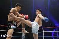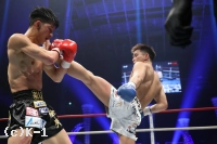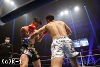 2R、与座が朝久の顔面へ前蹴り連打。朝久の入り際に与座がローを合わせ、朝久がバランスを崩す。与座の奥足へのローがローブローとなり一時中断。再開後は朝久が右テンカオで距離を詰めると、与座は奥足への左ローで応戦。至近距離で左ヒザを朝久のアゴへ叩き込む。朝久は距離を詰め左右フックを与座のガードに叩き込むが、与座は要所で左ローを返し朝久の足を削る。