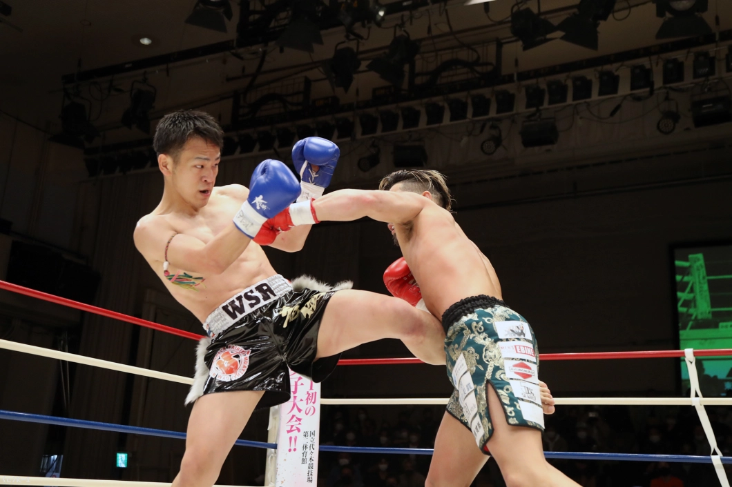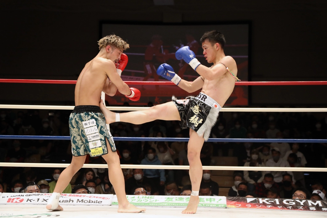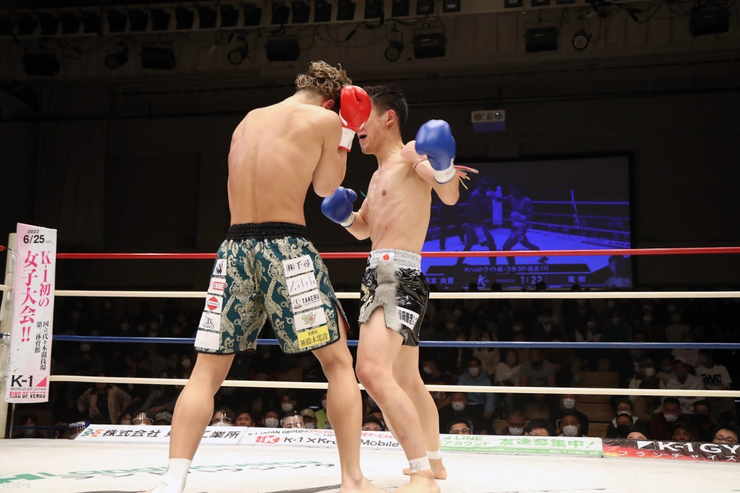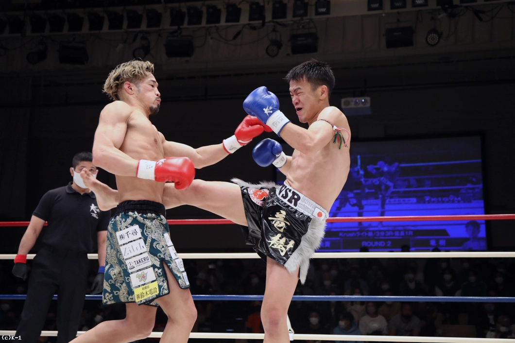 2R、竜樹は左フック、右ストレートとパンチの手数を増やす。東本は左フックを強振するが竜樹はこれをブロックして右ミドル。接近戦では竜樹が右ストレートと左フックで東本を下がらせる。左ボディフックを決める東本だが、竜樹が右ストレートをヒットする。