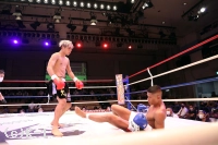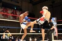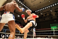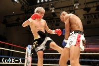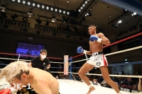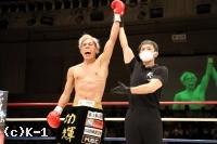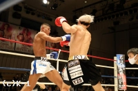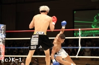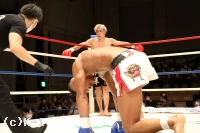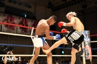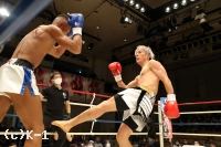 2R、赤田は松本をロープに詰めてボディへのヒザを効かせる。赤田を遠ざけたい松本だが赤田は下がらず、再度ボディへのヒザ。赤田はローも効かせていく。後退ベースとなる松本左ストレートを返すも力が落ちており、赤田は左ロー、左ストレートで攻める。3Rも赤田が前に出てプレッシャーを掛け左ローを効かせ、これでダウンを奪取。立ち上がる松本だが口が開いて力がなく、再び左ローにダウンを喫するとレフェリーが試合を止めた。