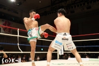 2R、中島は細かな足さばきから前蹴り、横蹴りを飛ばす。西元もボディに前蹴りを入れ、やはりロープ際に追い詰める。しかし中島はローや空手式の掛け蹴り、関節蹴りと放って中央に出る。