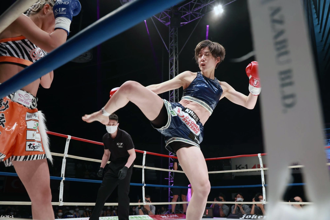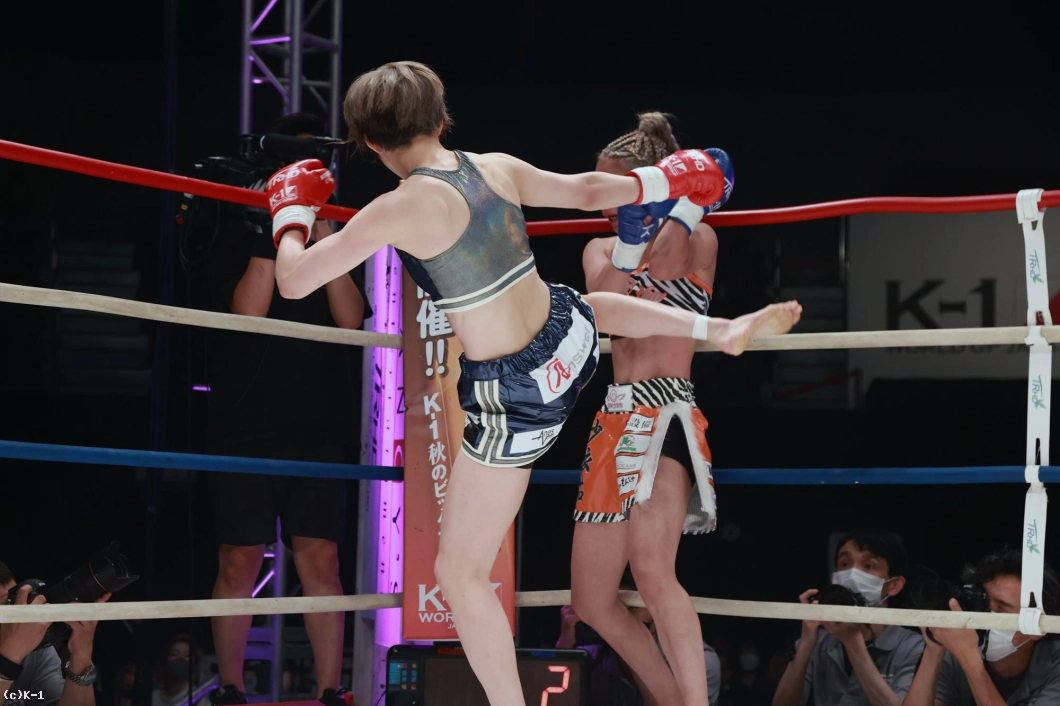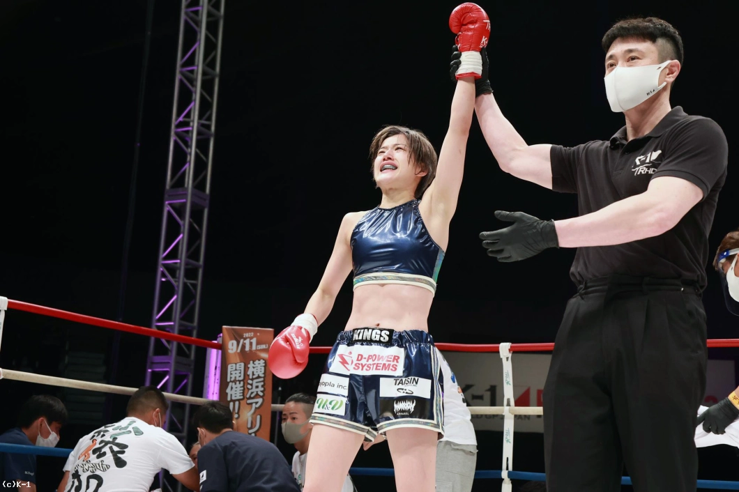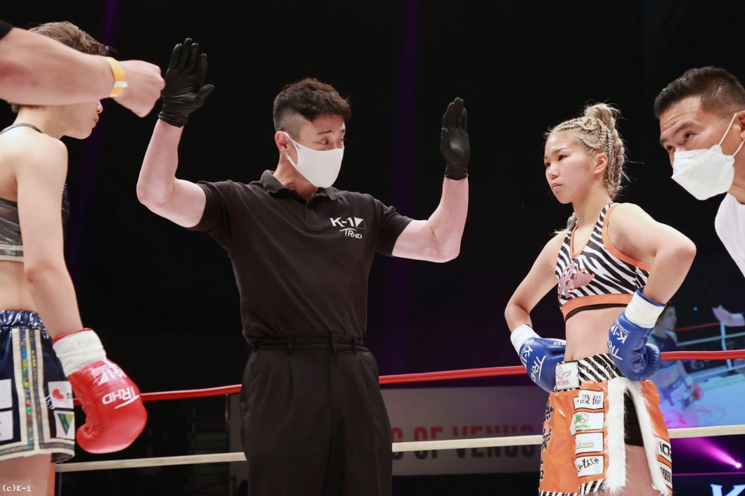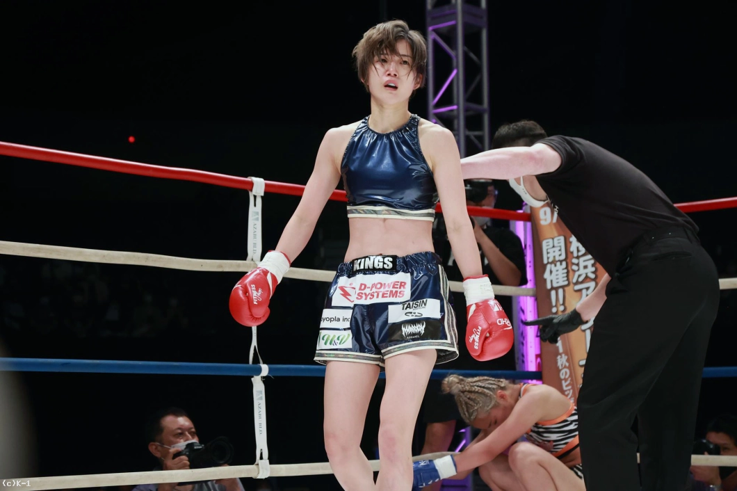 「(試合の感想は?)K-1初の女子大会で、自分もK-1出るの初めてで、その初K-1で初KOできて、とてもホッとしています。(相手の印象は?)1年前に戦ってて、1年ぶりの再戦で、見てる人にも再戦なので、自分の成長が今日見てもらって分かってくれたかなと思いました。(KOできたのは移籍してからの練習の成果?)そうですね。チームキングスに移籍してトレーナーと一緒に練習して、その成果が出ました。(一番よかった点は?)練習通りに戦えたことが一番よかったかなって思います。