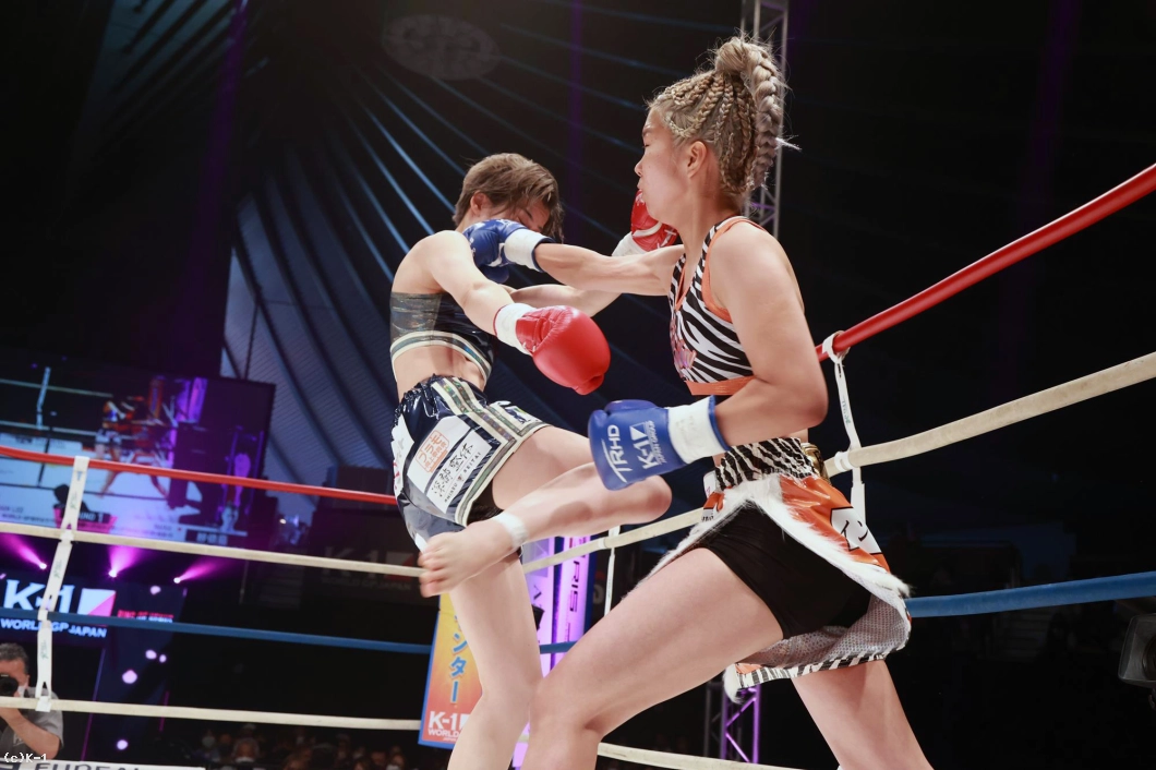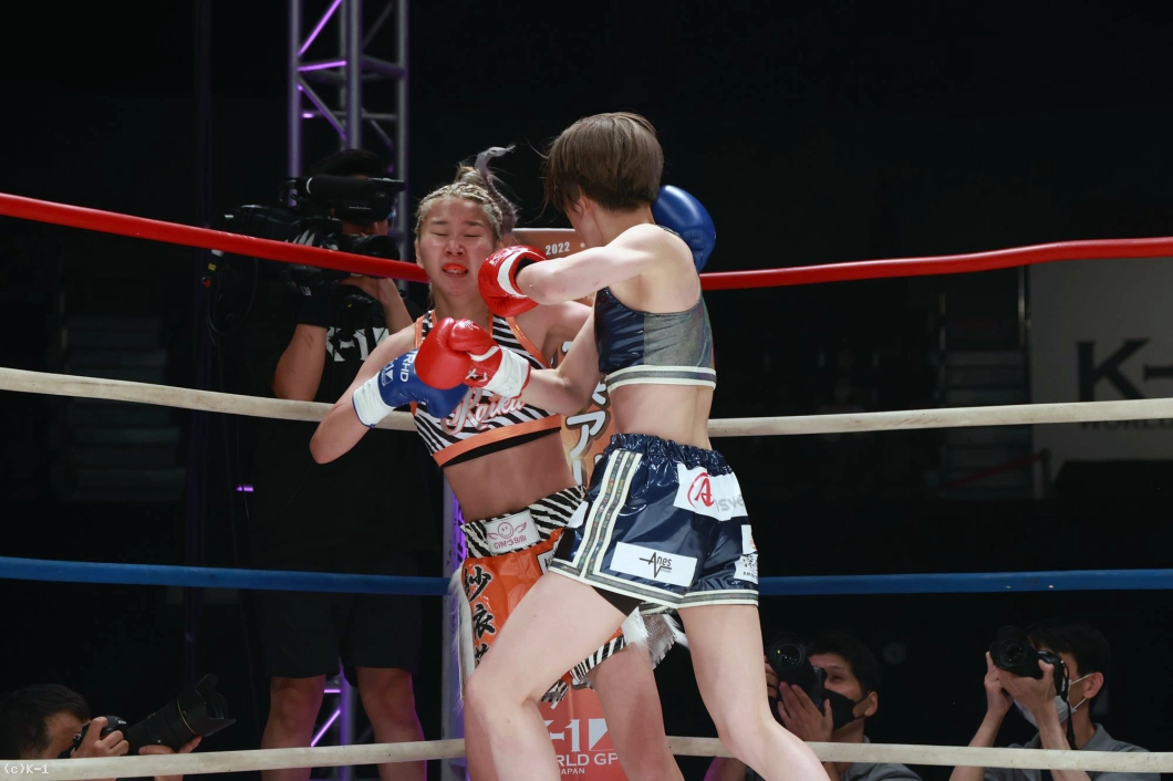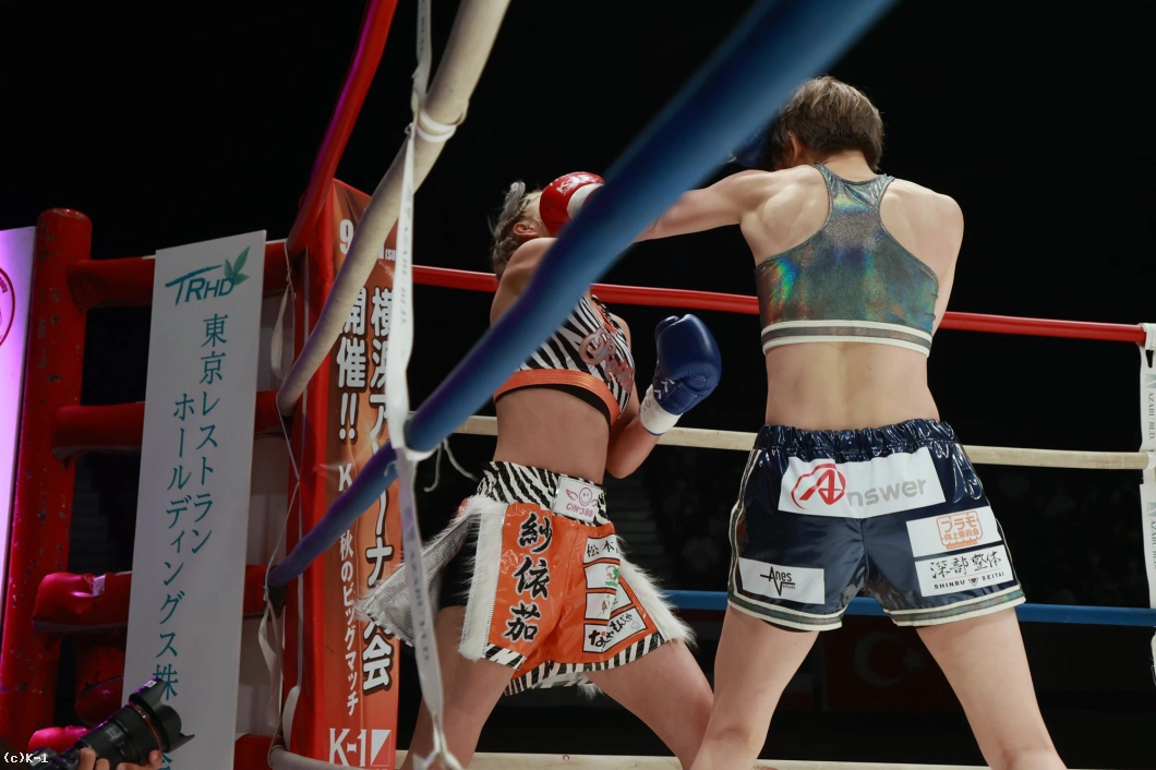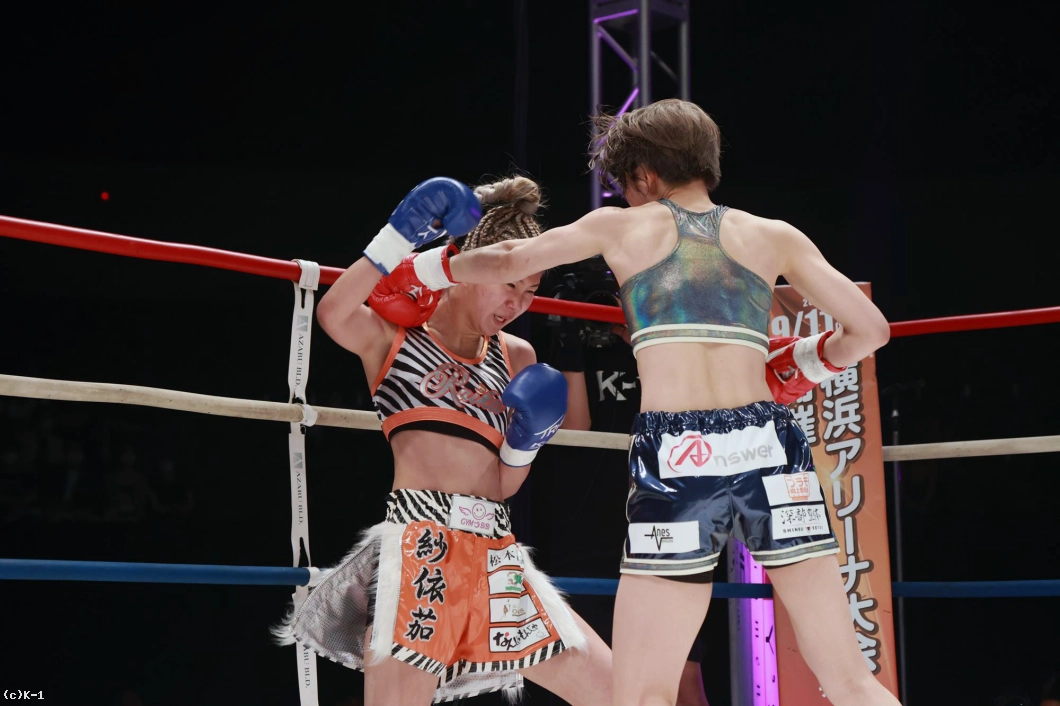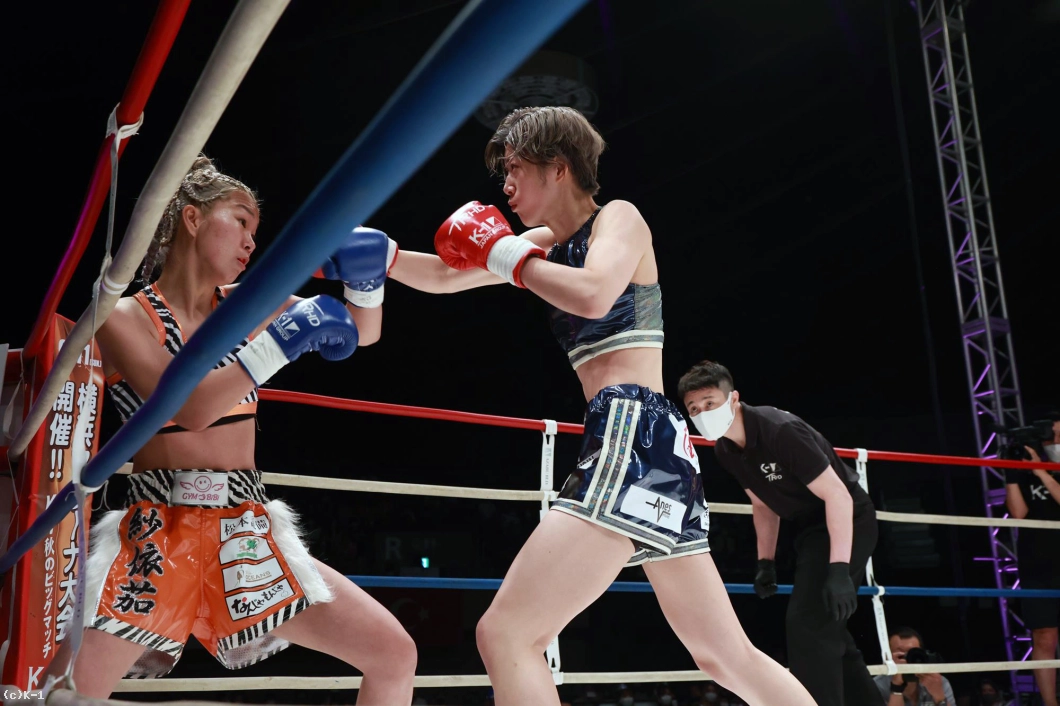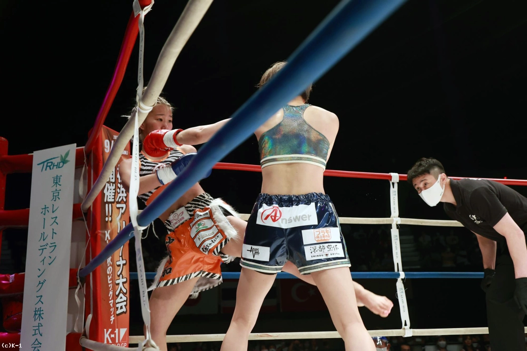 「(試合の感想は?)K-1初の女子大会で、自分もK-1出るの初めてで、その初K-1で初KOできて、とてもホッとしています。(相手の印象は?)1年前に戦ってて、1年ぶりの再戦で、見てる人にも再戦なので、自分の成長が今日見てもらって分かってくれたかなと思いました。(KOできたのは移籍してからの練習の成果?)そうですね。チームキングスに移籍してトレーナーと一緒に練習して、その成果が出ました。(一番よかった点は?)練習通りに戦えたことが一番よかったかなって思います。
