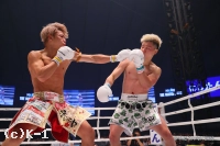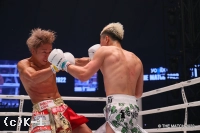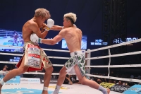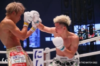 2R、じわりとプレッシャーをかける武尊が細かい左ロー。那須川は細かい出入りから左ヒザ。武尊が右ヒザを突き上げた勢いで那須川の顔面へバッティングになり、一時中断。再開後に那須川は鋭いワンツー。至近距離では武尊が強引に左右フックを繰り出しプレッシャーを強める。那須川はジャブを突き刺すも、武尊は前進を止めない。組み合いから武尊が那須川を投げてしまい再度一時中断。レフェリーから口頭注意をうける。追う武尊に那須川がジャブをヒットし距離を詰めさせない。