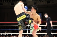 2R、ボディ・顔面とフックを散らす小嶋に松本はガードを固めて前に出てヒザとストレートで応戦する。小嶋は距離を詰めて松本のストレートを浴びず、左右フック・ストレートを回転させ松本を打ち倒してダウンを奪う。