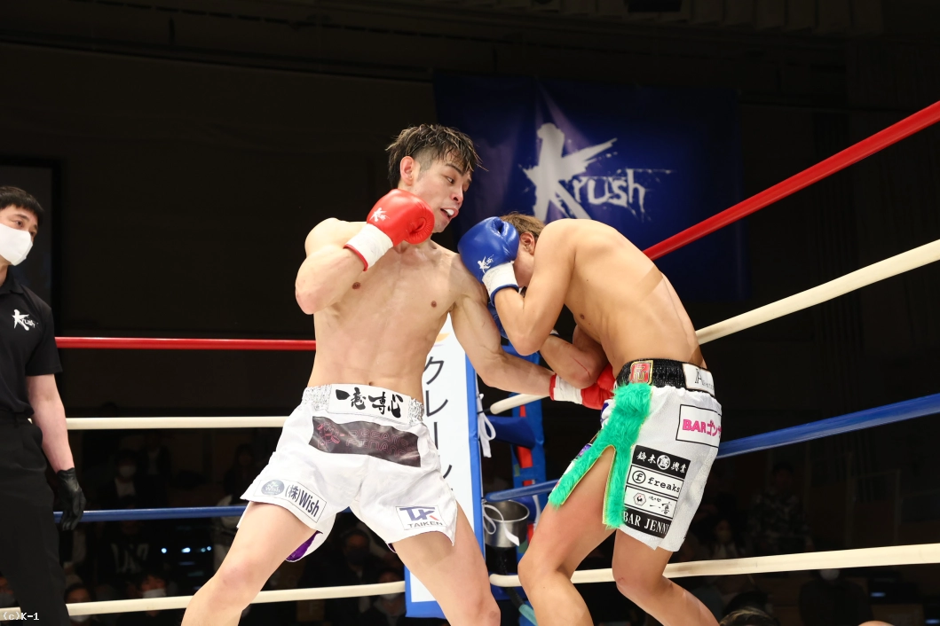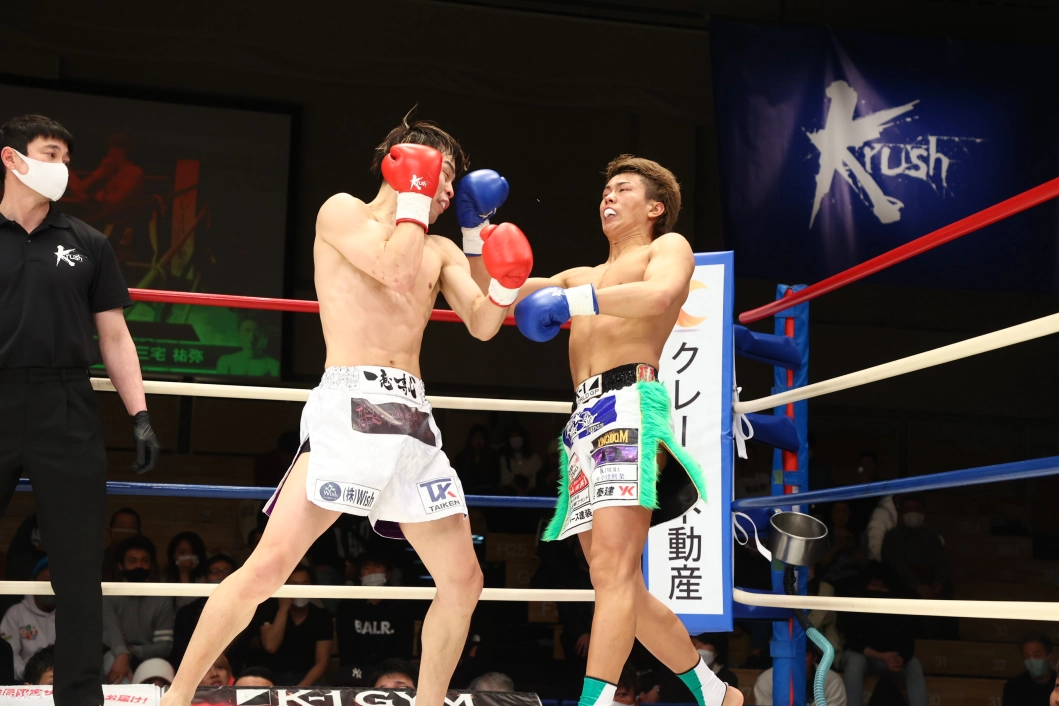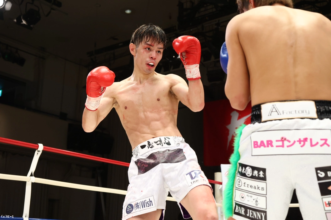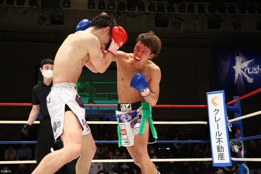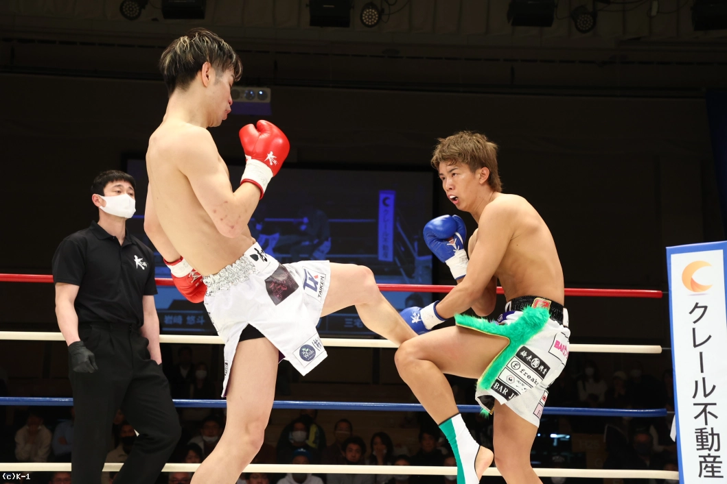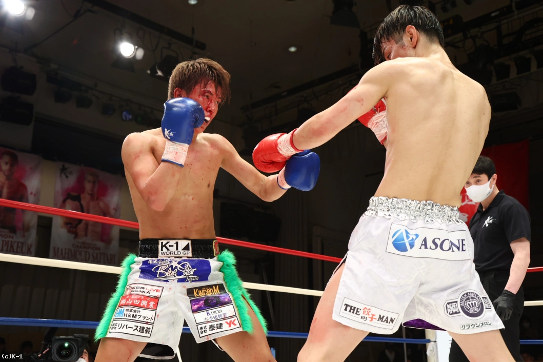 再開しても岩﨑が先手を取り、ミドルでボディをとらえ、そこから顔へのパンチを返すと三宅の傷が開いてきて再び顔が鮮血に染まる。