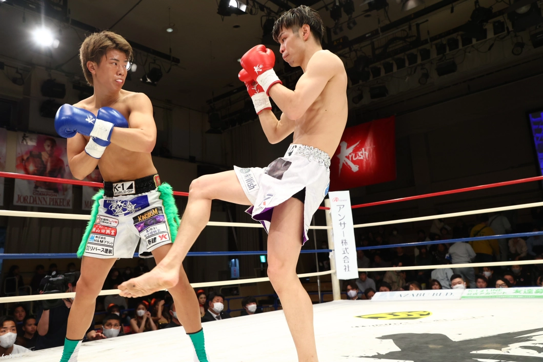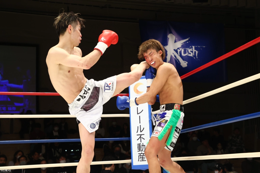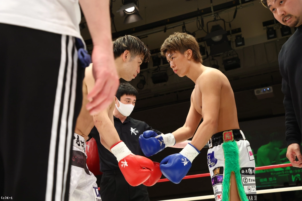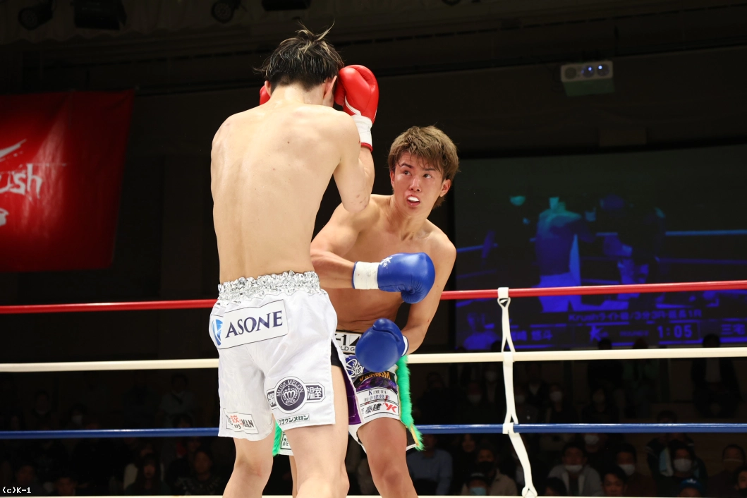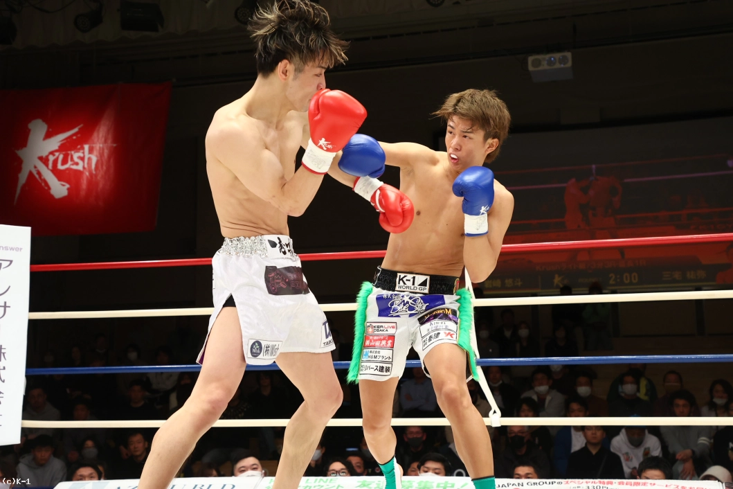 再開しても岩﨑が先手を取り、ミドルでボディをとらえ、そこから顔へのパンチを返すと三宅の傷が開いてきて再び顔が鮮血に染まる。