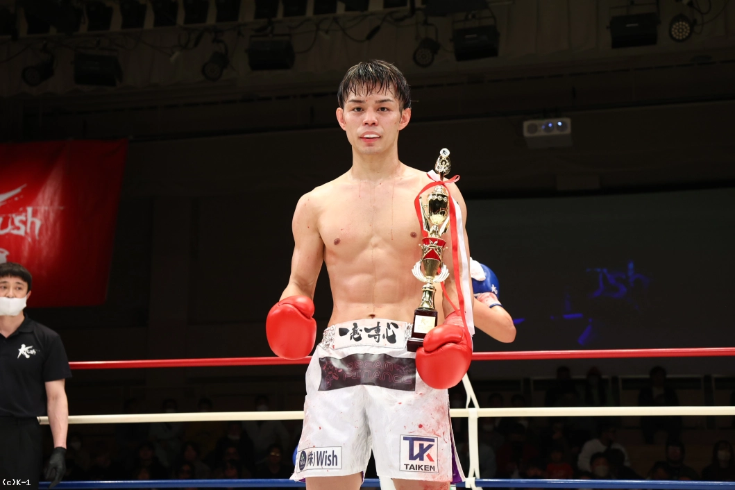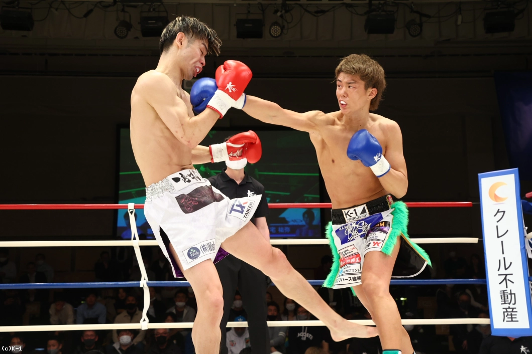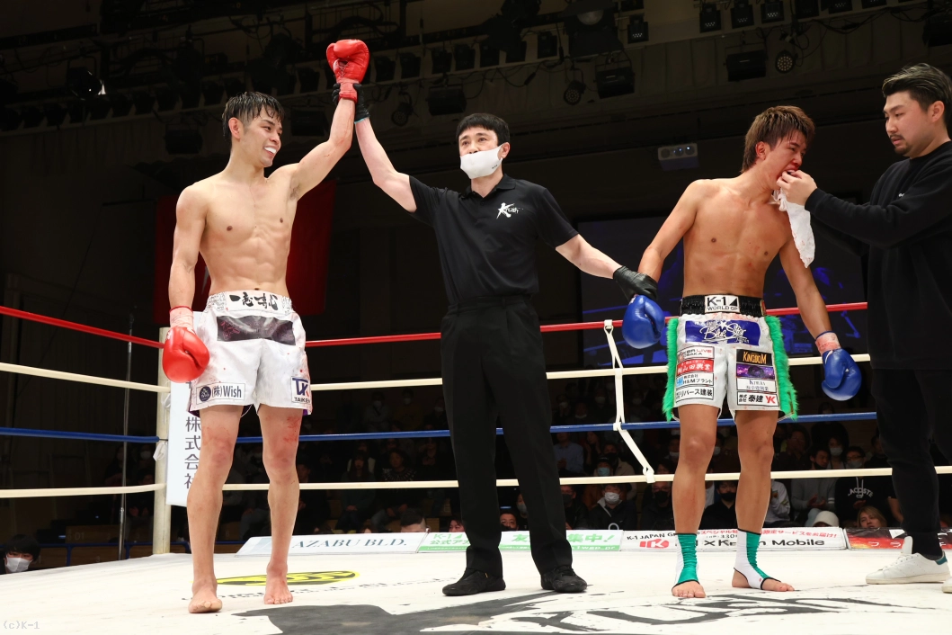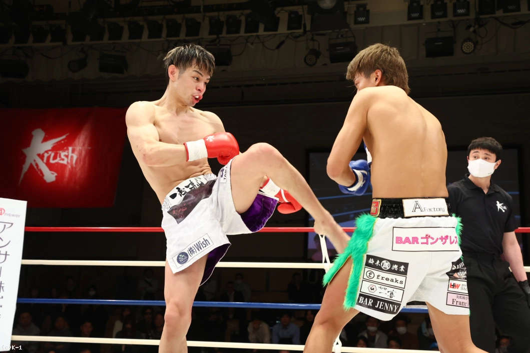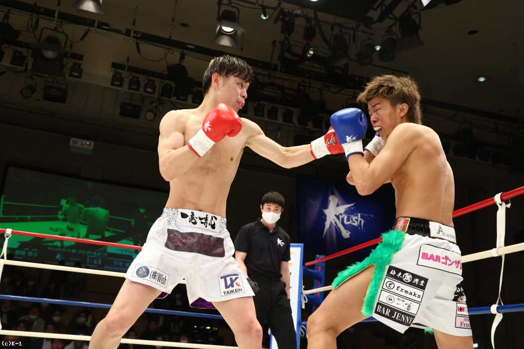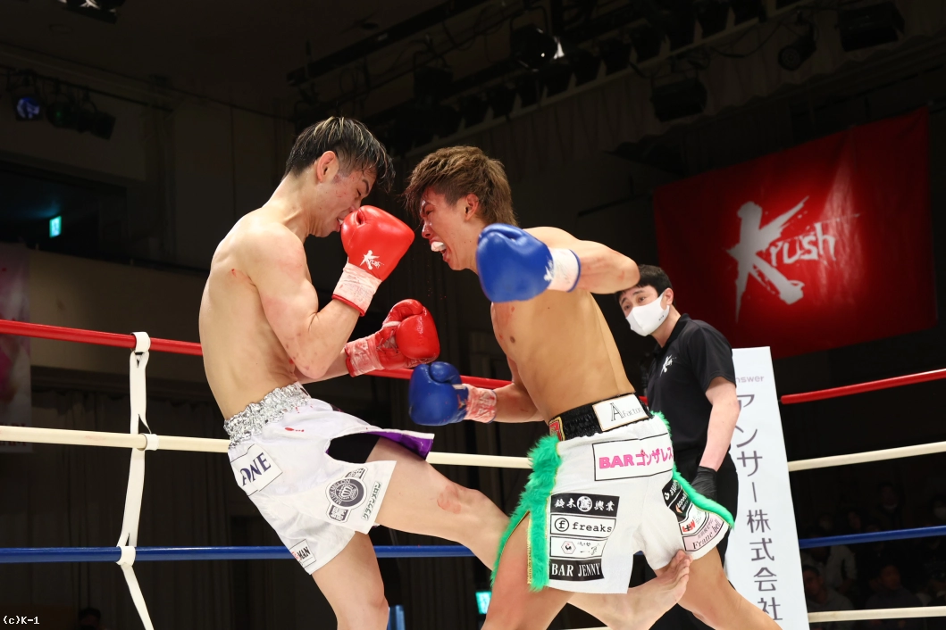 再開しても岩﨑が先手を取り、ミドルでボディをとらえ、そこから顔へのパンチを返すと三宅の傷が開いてきて再び顔が鮮血に染まる。