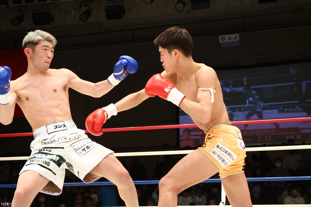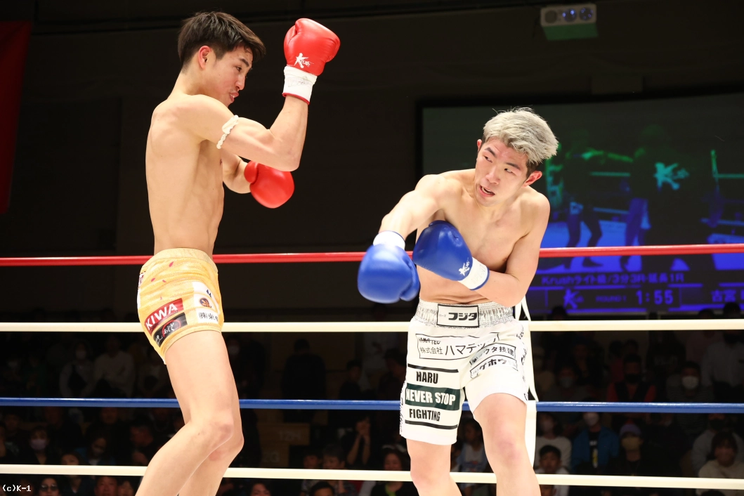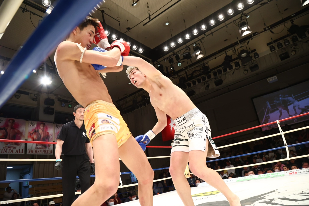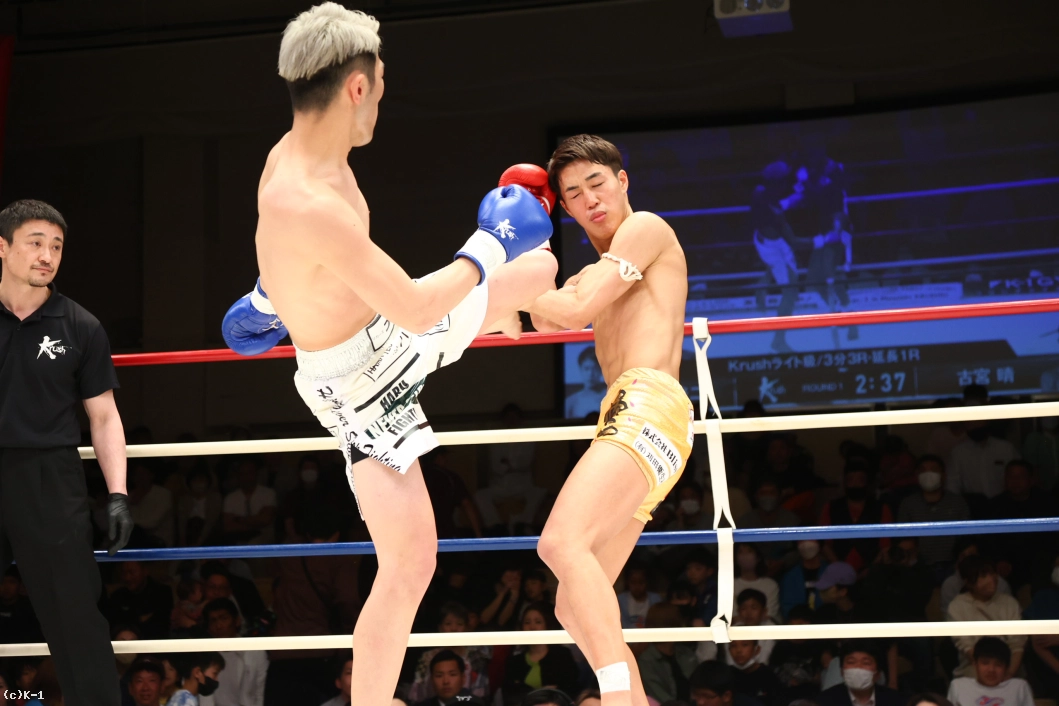 3Rも瓦田は古宮に圧力を掛けていく。古宮は左右のカーフキックで瓦田を動きを止めにかかる。瓦田は体の強さを活かし、近距離戦に持ち込んでボディ打ち。古宮もパンチからハイキックと返すが、瓦田が押して行って試合終了となる。判定は30-29、30-29、30-29の3-0で古宮。元王者を下す1勝をあげ、5連勝とした。