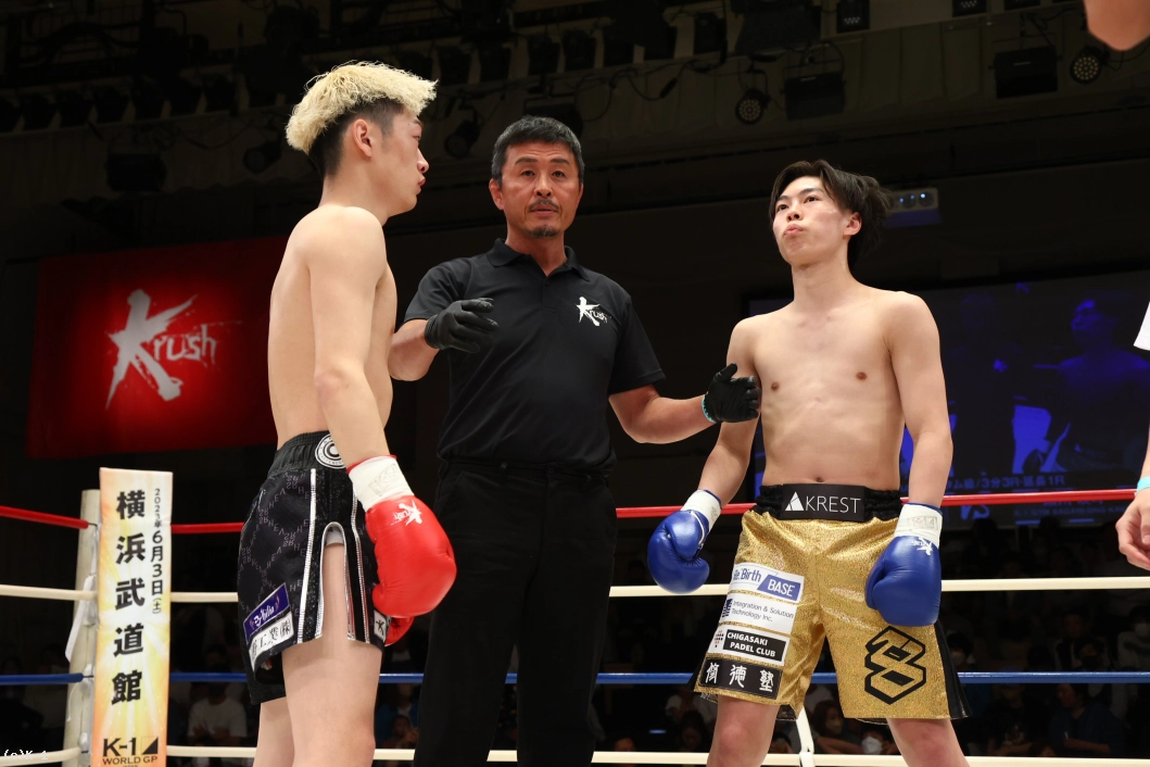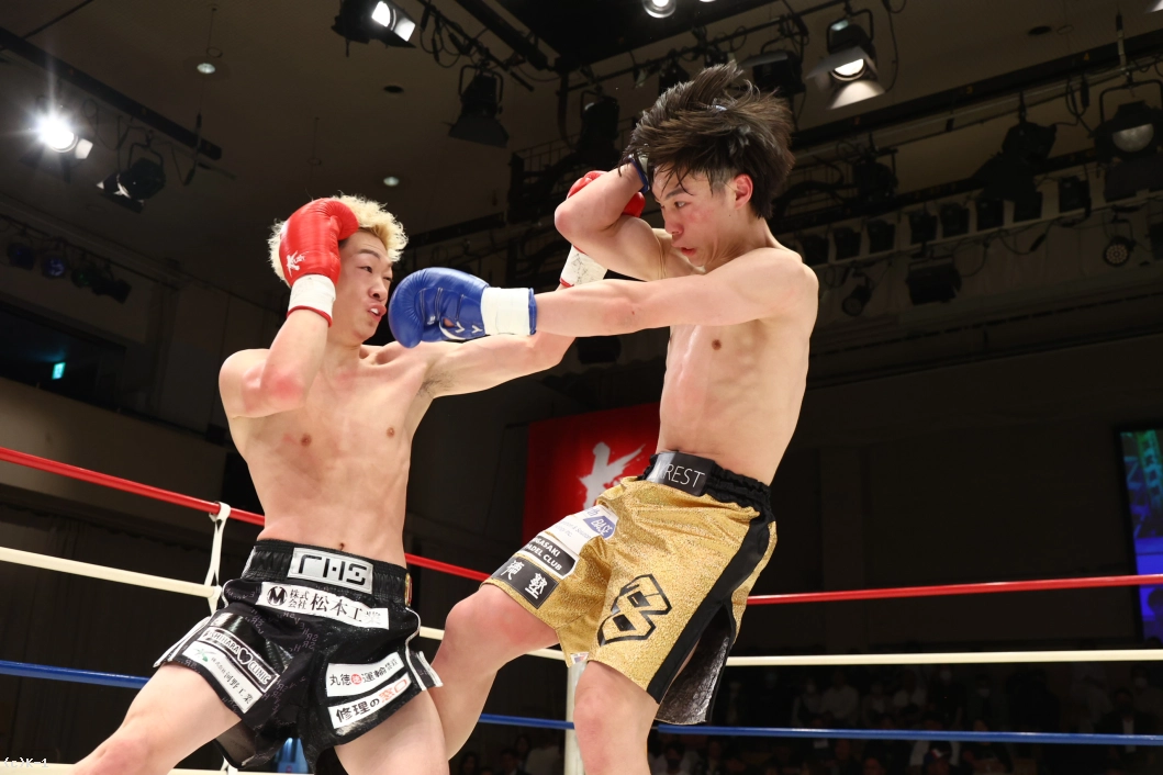 3R、ここも黒川が前に出るが、松本も1・2Rほど下がらず応戦。どちらも目がよくクリーンヒットを与えられない展開が続く。黒川が左ストレート、松本が左フックをヒットするも均衡は破れない。松本が右ストレートを当て、試合終了となる。判定は30-30、30-29、30-30で松本に1票入るもドローで、延長戦に突入となる。