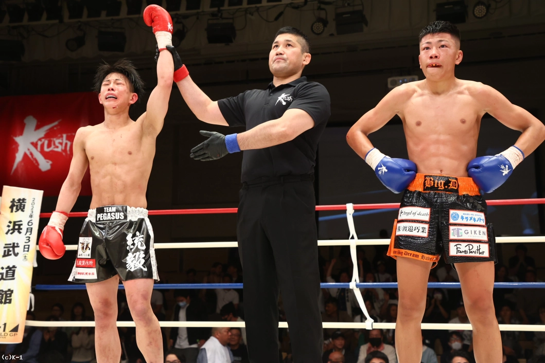 3R、大夢は前に出て左・右とストレートを打ち込む。大鹿はロープ・コーナーを背にするが、そこからパンチ・ミドルを返す。大夢がパンチを強振してきても、大鹿はよく見えており頭を振ってクリーンヒットさせない。判定は30-29、30-29、30-29の3-0で大鹿。プロ無敗のまま涙の王座戴冠を果たした。