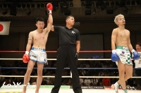 3R、開始直後に2Rのインスタントリプレイにより、健介のノーダウンがダウンと判断される。健介が逆転を狙い前に出るが、竹内は距離を保つ。健介はノーモーションの左ストレートを浅くヒットさせるが、竹内は追撃を許さず。健介が距離を詰めるとヒザを突き上げ、ヒット数を稼ぎながら試合終了のゴングを迎えた。判定は竹内が2Rのダウンのポイントを守り切り勝利。竹内がベテランの技で健介の勢いをシャットアウトした。