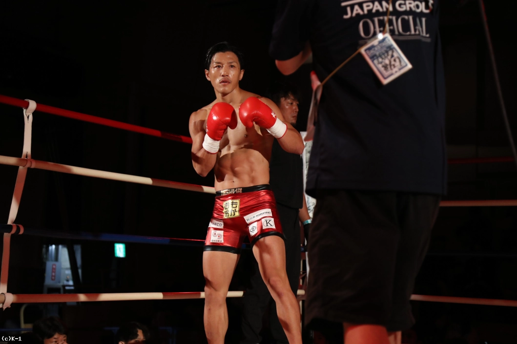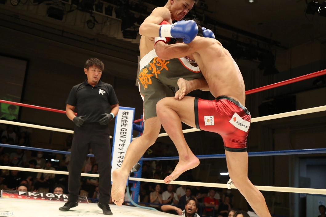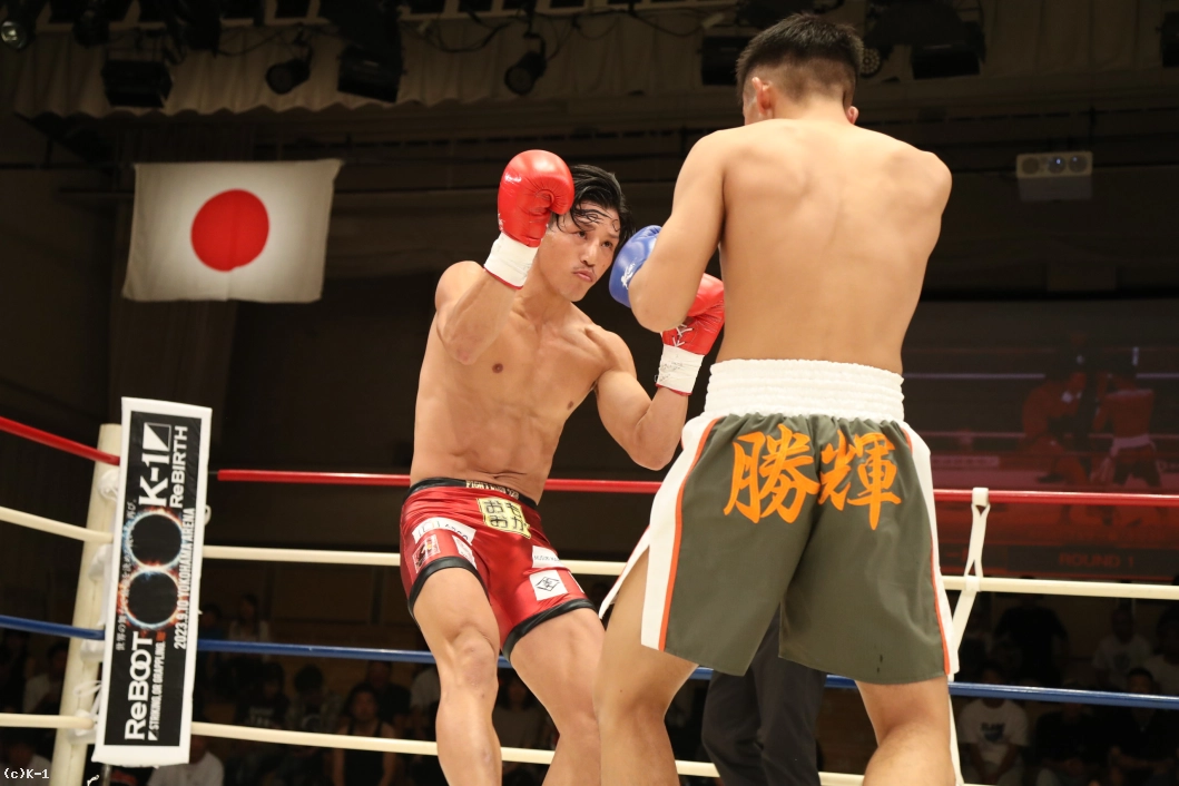 1R、勝輝が右カーフから左アッパー、右フックのコンビネーションでダウンを奪取。久保はガードを固めるが、勝輝が左アッパーをヒットさせる。勝輝はパンチのコンビネーションから左ミドルと多彩な攻撃を見せる。久保はダメージの色が見えるが、ワンツーから左ヒザを突き上げ反撃する。