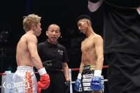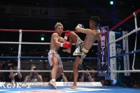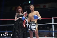 1R、両者オーソドックスで距離を詰めていく晃貴に岩尾はジャブと左右ミドル。このミドルを的確に当て、ボディフックを打ち込むと、晃貴はたまらずダウンを喫する。再開後、立ち上がった晃貴に岩尾は攻め手を緩めずミドルを見舞い、最後は再びボディフックを打ち込み晃貴を沈めた。勝利した岩尾はスペシャルラウンドガールの安斉かれんさんからトロフィーを贈られた。