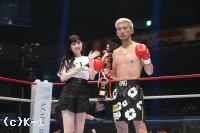 2R、龍華は膝を狙った蹴りを放つがこれが篠原の下腹部に。一度はダウンが宣せられるが、ローブローと判断され取り消しとなる。