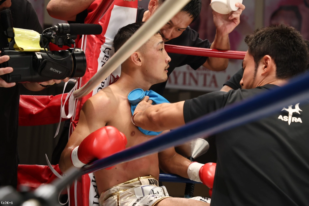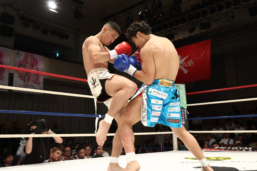 2R、圧力をかける大岩に、呼び込んでヒザを突き上げる伊藤。伊藤の右カーフを受けながら大岩は前進を続け、右フックをオーバーハンドで叩き込む。伊藤が右カーフから右アッパーのコンビネーション。打ち終わりに大岩が右フックを直撃させ伊藤からダウンを奪う。ややダメージの跡が見える伊藤へ襲いかかる大岩は、下がる伊藤を右フックで追撃。ロープを背負った伊藤は足を止めたパンチで応戦し、ラウンド終了まで耐えきる。