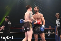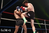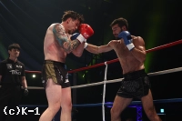 2R、ここでもムシンスキは、前へ出てきてパンチと蹴り。アカピャンはロープを背に、ハイキックのカウンター。ムシンスキはローキック、ヒザ蹴り、パンチとまとめる。アカピャンは守りに入りながら、蹴りを返す。ムシンスキは右フックもガードの上、アカピャンは右の鋭いパンチを返すも、劣勢のイメージか。