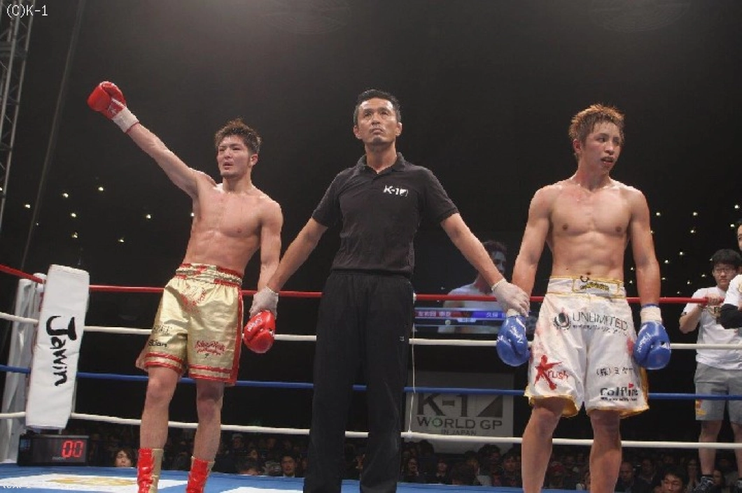 3R、お互いに額をつけて打ち合う両者。久保が距離を作って左ミドルを蹴ると、すぐに距離を潰す左右田がヒザ蹴りを連打する。クリンチが増える展開の中、ここでも左右田の左フックと右がヒット。久保もボディ打ちで応戦するが、クリンチが増えてしまい、久保に痛恨の減点1が言い渡される。再開後、両者が激しく打ち合ったまま試合終了。左右田が久保との接戦をモノにした。