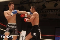 2R、右ストレートで前に出ていく山崎。中島も右ローを返して譲らない。距離を取って右ローを蹴り、そこから左ハイキックにつなげる中島。山崎は左ボディ・左アッパーで前に出ていくが、中島は必ずローを蹴り返す。