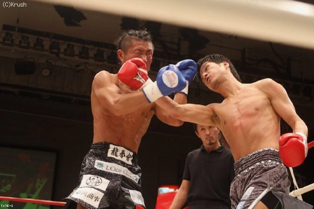 2R、青津が右ストレートと右ローで前に出る。そこに左フックを狙う中村。青津はローを蹴って、ガードを固める中村に連打をまとめる。中村も飛びヒザ蹴りからパンチの打ち合いに持ち込み、一気に連打。青津も打ち合い、お互いのパンチが顔面をとらえる。ここで中村が右目尻をカットし、ドクターチェックが入る。再開後、パンチと前蹴りで前に出る中村。青津はタイミングよく左フックをヒットさせる。