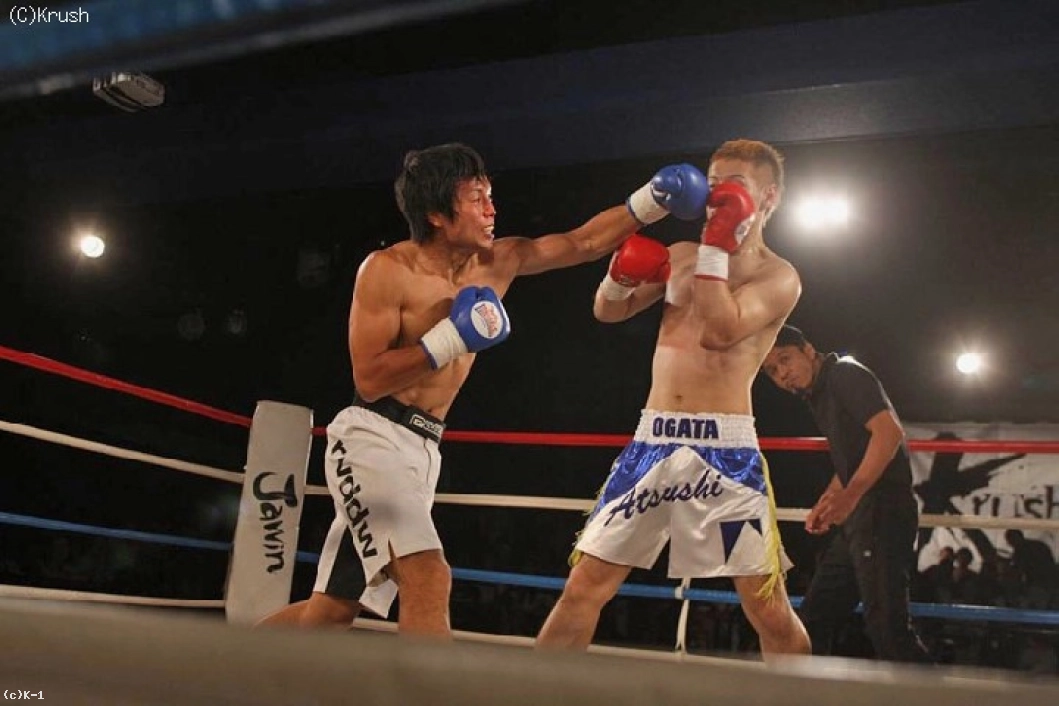 3R、ローを蹴って前に出る菊崎。緒方もジャブを当てて左ストレートと左フックを返す。下がりながらパンチを打つ緒方を菊崎がパンチで追いかけるという展開で試合終了。判定はドローに終わった。