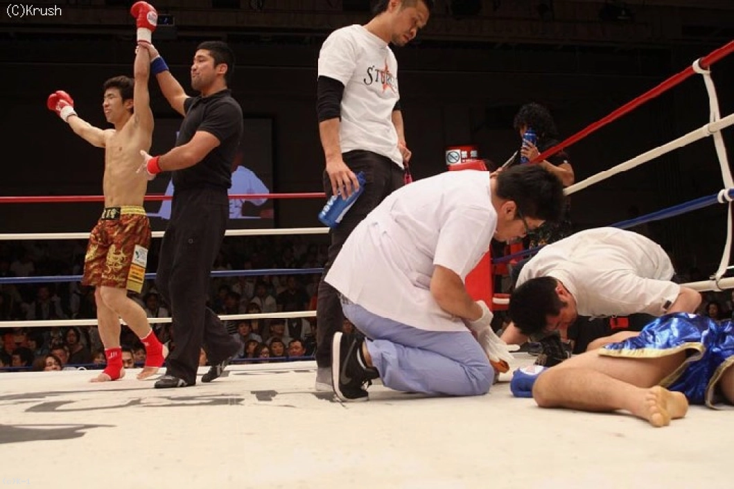 2R、左ミドルを蹴って前に出る平塚。野辺も右ストレートを返してロー、お互いにパンチとローで真っ向勝負する展開が続くが、パンチの打ち合いから平塚がバックブロー一閃。この一発で野辺が前のめりに倒れ、平塚が見事なKO勝利を収めた。