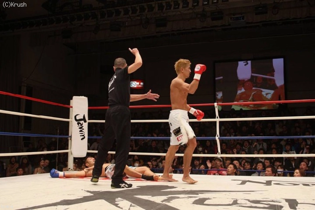 これで守屋が後方にバッタリと倒れ、城戸がダウンを奪う。必死に立ち上がろうとする守屋だが、立ち上がることが出来ず。城戸が見事なKO勝利で因縁のタイトルマッチにケリをつけ、初防衛に成功した。
