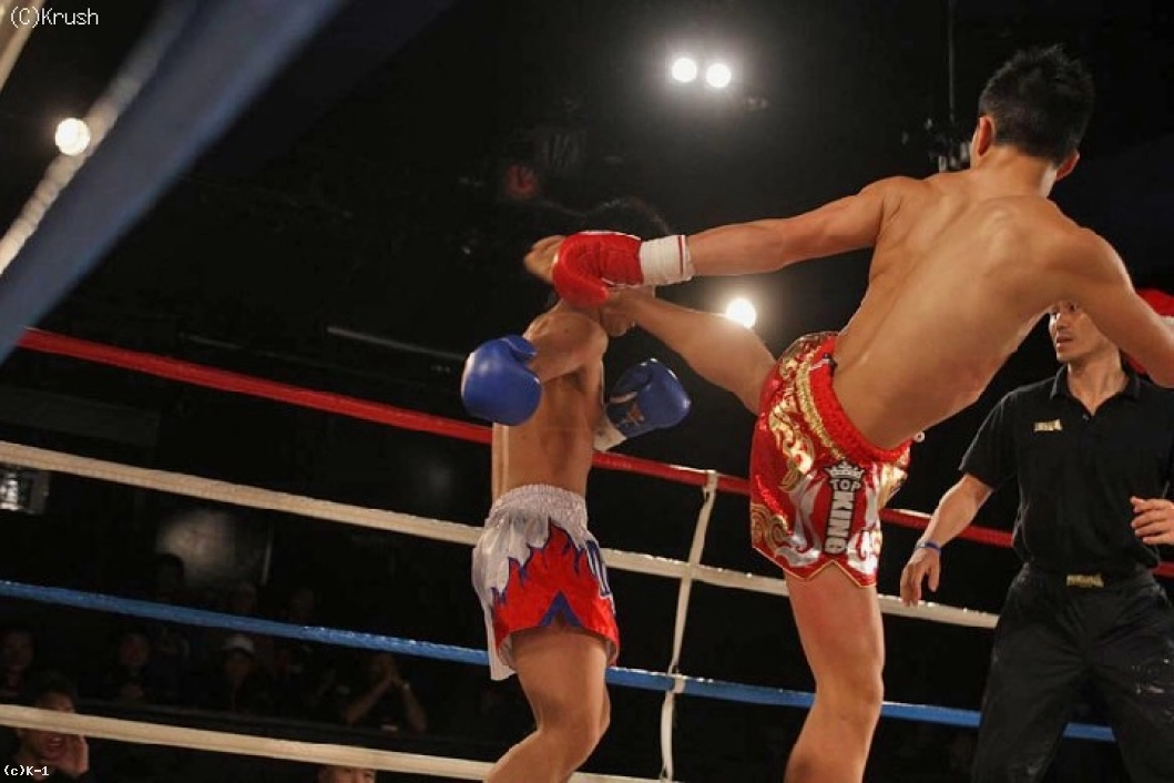 2R、お互いに距離を探る展開が続く。リョウタが大雅をロープまで詰めてヒザ蹴りから左ストレート。大雅も左ハイキックを返して、左ローを連打する。