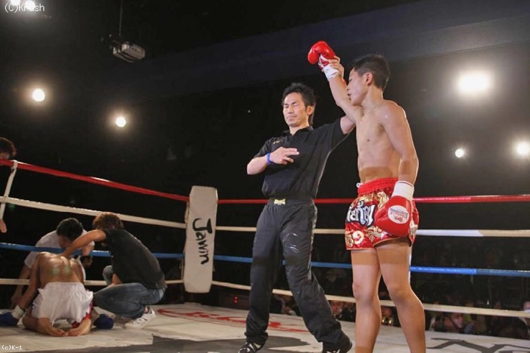 3R、大雅が左ローを蹴ってパンチで前進、バックブローを当ててダウンを奪う。再開後、リョウタも左ストレートで前に出るが大雅が強烈な左のボディストレート。これでリョウタがうずくまるようにしてダウンする。何とか立ち上がったリョウタだったが、大雅が左ハイキックで3度目のダウンを奪い、デビュー戦を勝利で飾った。