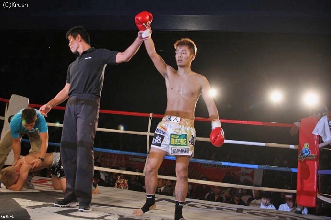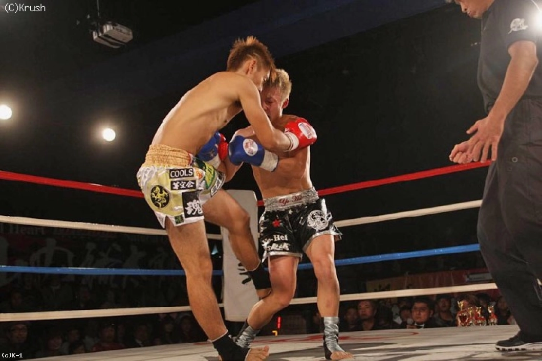 2R、顔面のガードを固めて伊澤は左右のローを蹴る。Yo-heiも右アッパー、左ボディを返すが、伊澤は確実にローを当てて、足へのバックスピンキック。これをズバリと決めて、Yo-heiの足を止める。さらに伊澤はローの乱れ打ちから顔面へのヒザ蹴りでダウンを奪う。立ち上がったYo-heiの伊澤は奥足ローを蹴ってダウンを追加。最後は再び奥足ローでYo-heiをマットに沈めた。